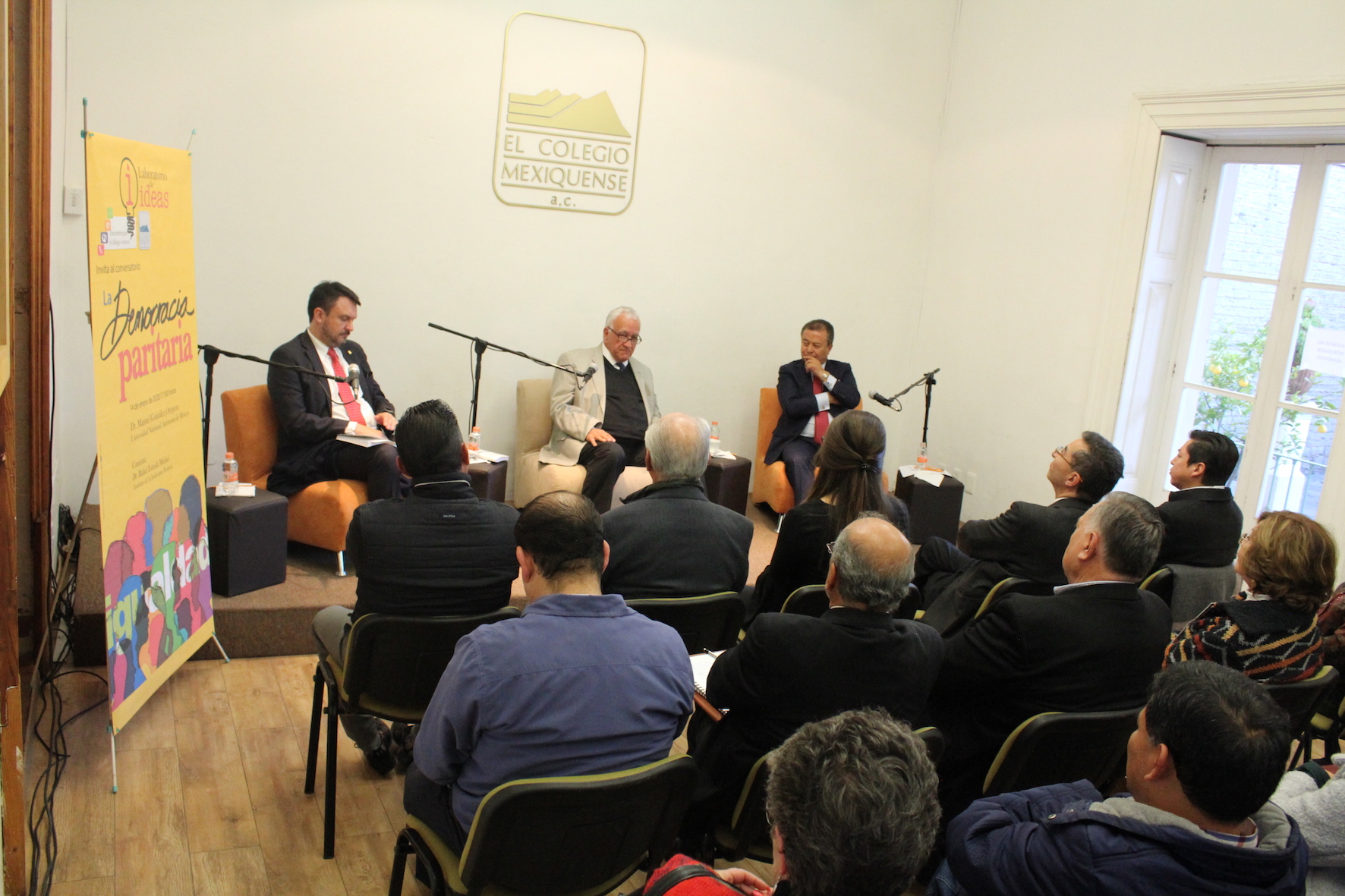 Se llevó a cabo en El Colegio Mexiquense el conversatorio «Democracia paritaria», entre los juristas Manuel González Oropeza y Rafael Estrada Michel, con los comentarios de César Camacho