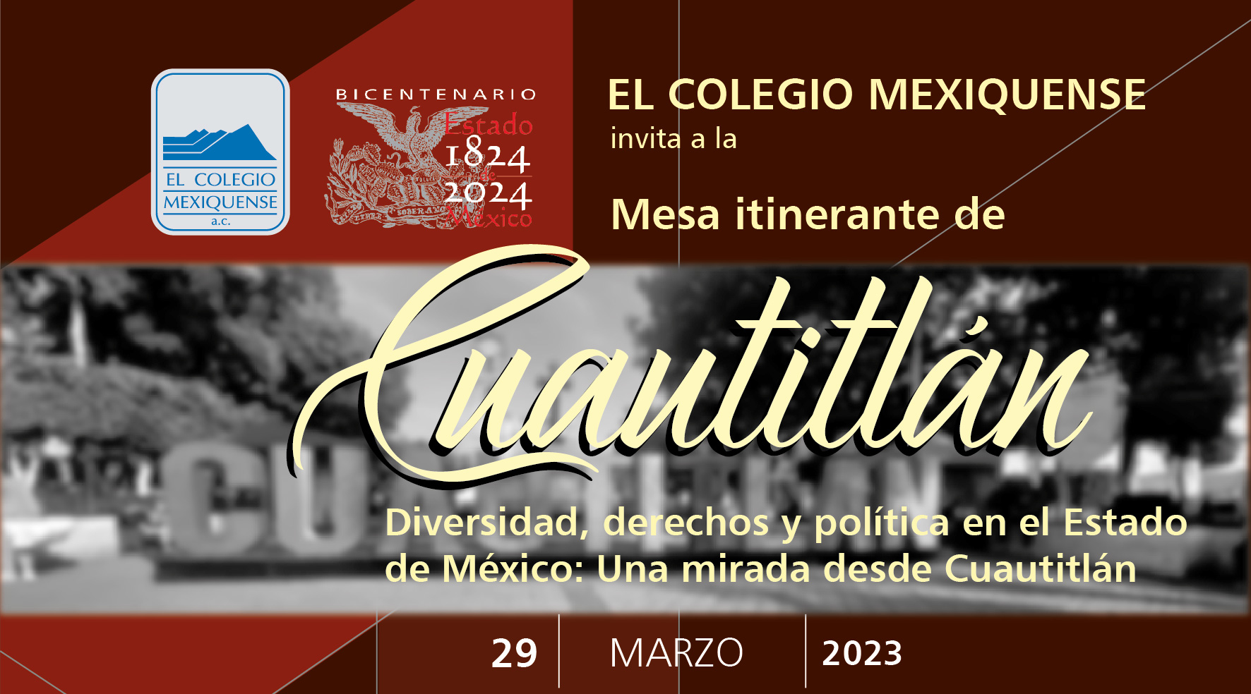 El Colegio Mexiquense dedicará la última semana de marzo a atender temas de la actualidad del Estado de México y el país, que incluyen conferencias sobre mujeres y pobreza, así como la economía de la entidad en las últimas cuatro décadas, un coloquio en el que se hablará de género, desigualdades persistentes, movimientos sociales y políticas públicas, la mesa itinerante relativa a la diversidad, los derechos y la política desde el municipio de Cuautitlán, además de la situación del desplazamiento por violencia en Zacatecas.