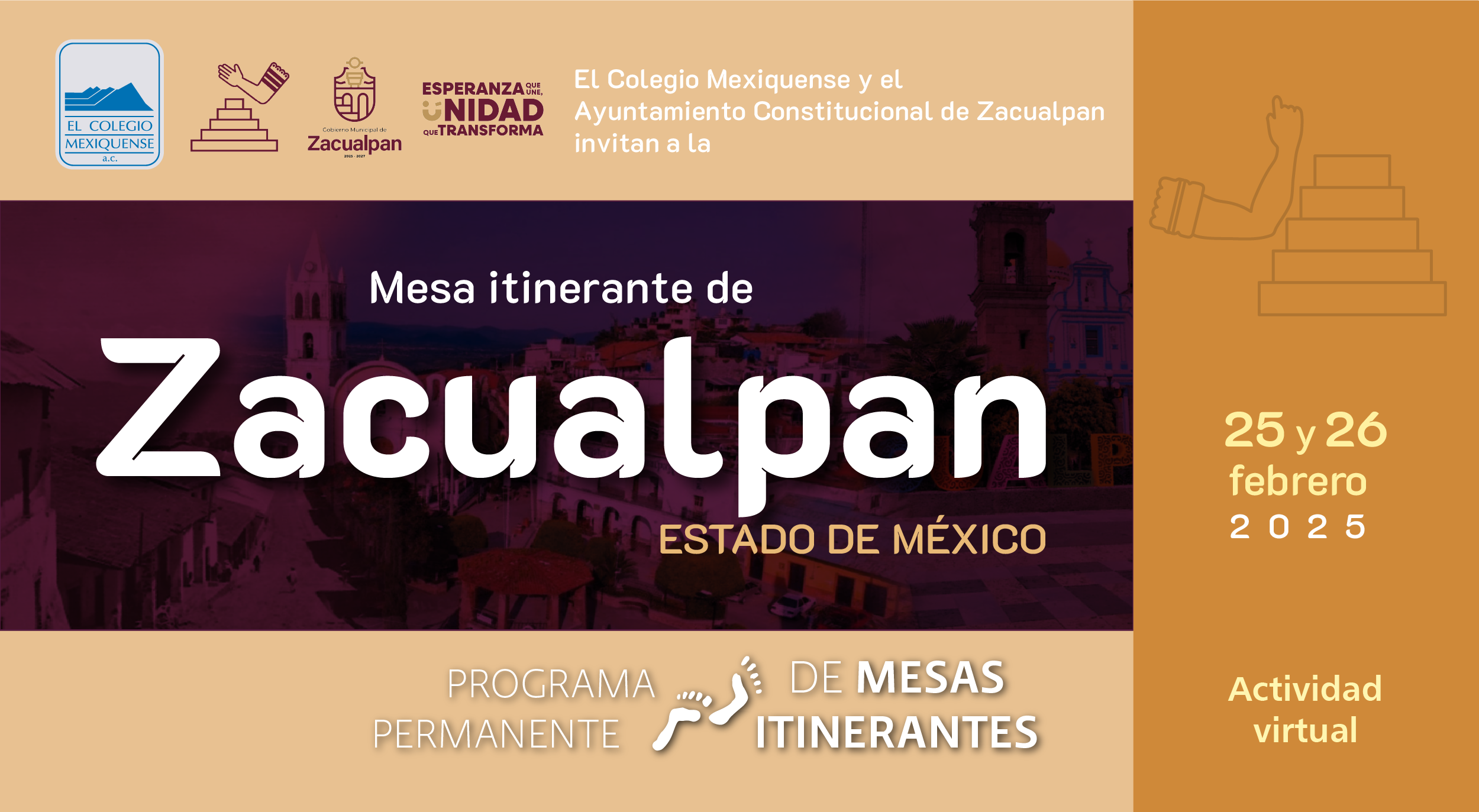 La segunda mesa itinerante de 2024 que organiza El Colegio Mexiquense estará dedicada a Lerma, uno de los municipios más emblemáticos del Valle de Toluca, y se realizará el miércoles 21 de febrero, a partir de las 10:00, en el Foro Cultural Tiempo y Espacio Thaay, de la cabecera municipal, al que se invita a todo el público.