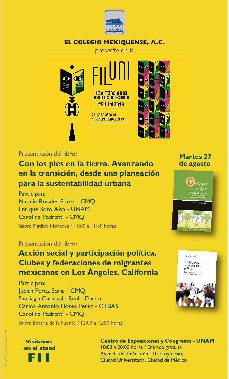 Zinacantepec, Estado de México, 20 de agosto de 2019. El Colegio mexiquense, A. C. (CMQ), presentará en la tercera edición de la Feria Internacional del Libro de los Universitarios (FILUNI) organizada por la Universidad Nacional Autónoma de México dos novedades editoriales, dedicadas, respectivamente, a la necesidad de que la planeación tenga un enfoque sustentable y al análisis de los procesos asociativos de los migrantes mexicanos en Estados Unidos, en particular en la ciudad de Los Ángeles, que resultan oportunas en relación con la emergencia ambiental de mayo y la política antiinmigrante del presidente Donald Trump.