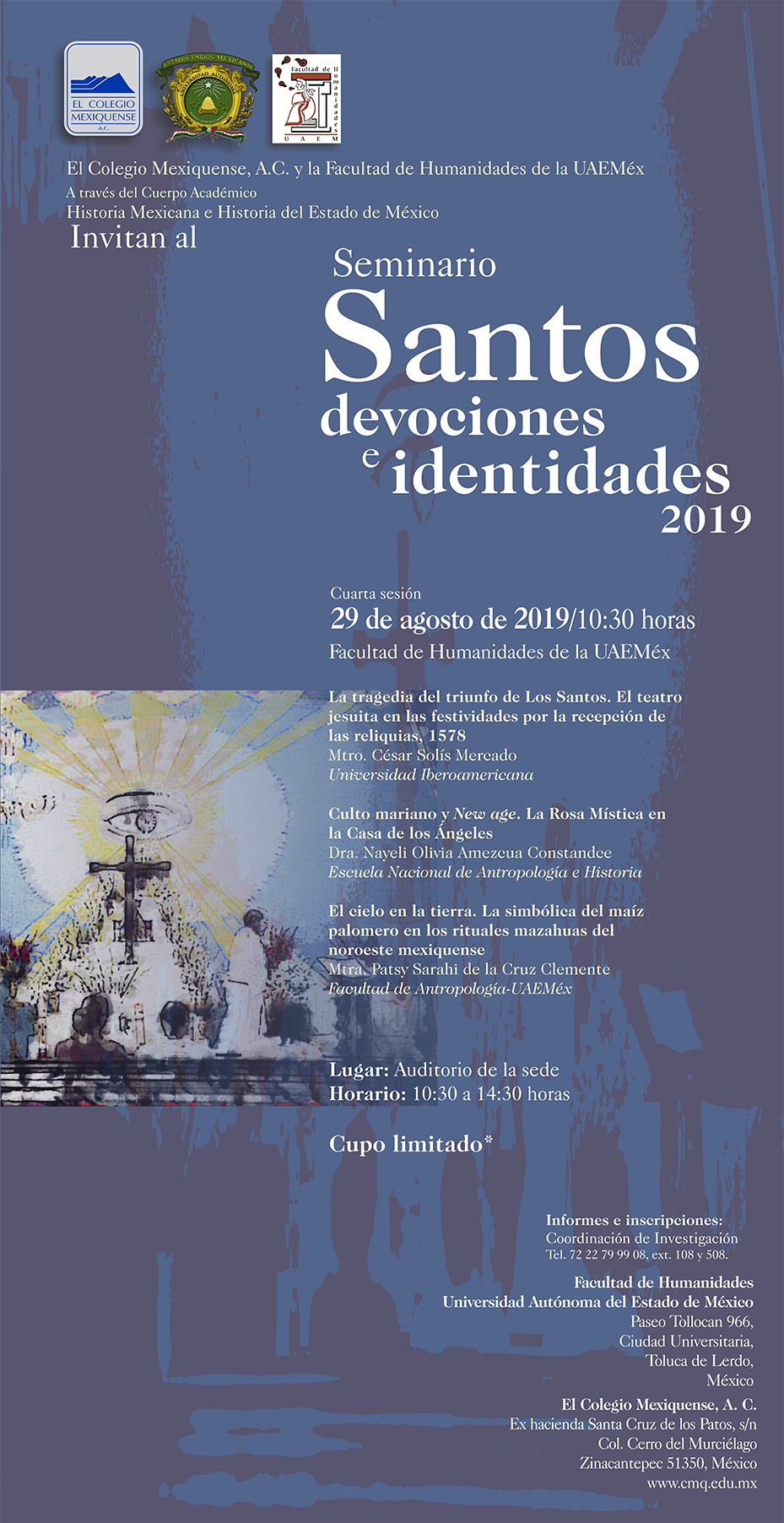 El jueves 29, a partir de las 10:30, en el auditorio de la Facultad de Humanidades de la UAEMex, en Ciudad Universitaria, sesionará el Seminario Santos, devociones e identidades, coordinado por los historiadores María Teresa Jarquín y Gerardo González Reyes, al que concurren investigadores de la religiosidad popular.