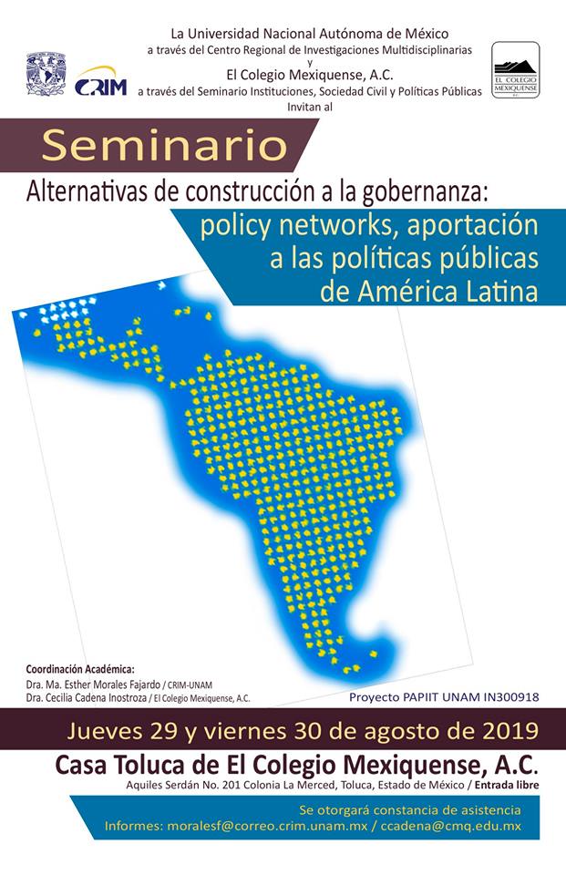 El jueves 29 y el viernes 30, también en La Casa Toluca, se llevará a cabo el Seminario «Alternativas de construcción a la gobernanza: policy networks, aportación a las políticas públicas de América Latina», coorganizado con el Centro Regional de Investigaciones Multidisciplinarias (CRIM) de la UNAM.