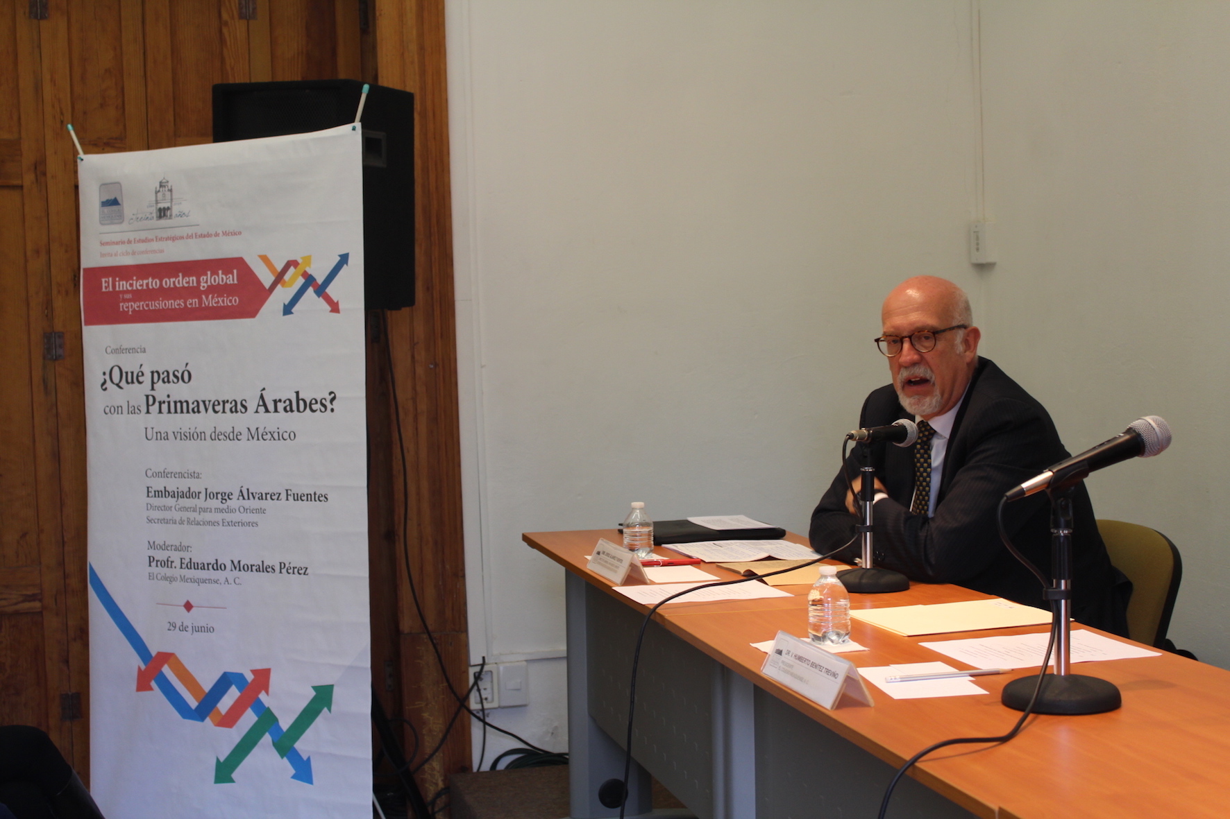 Acompañado por el investigador y el presidente de la institución, Víctor Humberto Benítez Treviño, el embajador Álvarez Fuentes analizó cada uno de los casos de las naciones que han vivido lo que él, en plural, denomina como “las primaveras árabes”.
