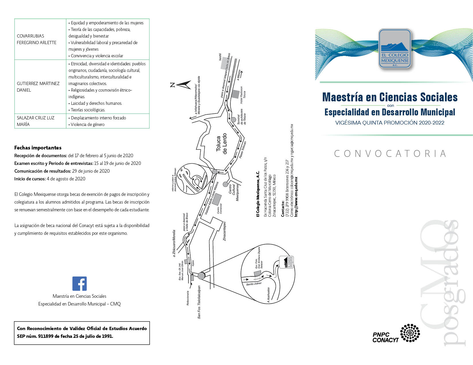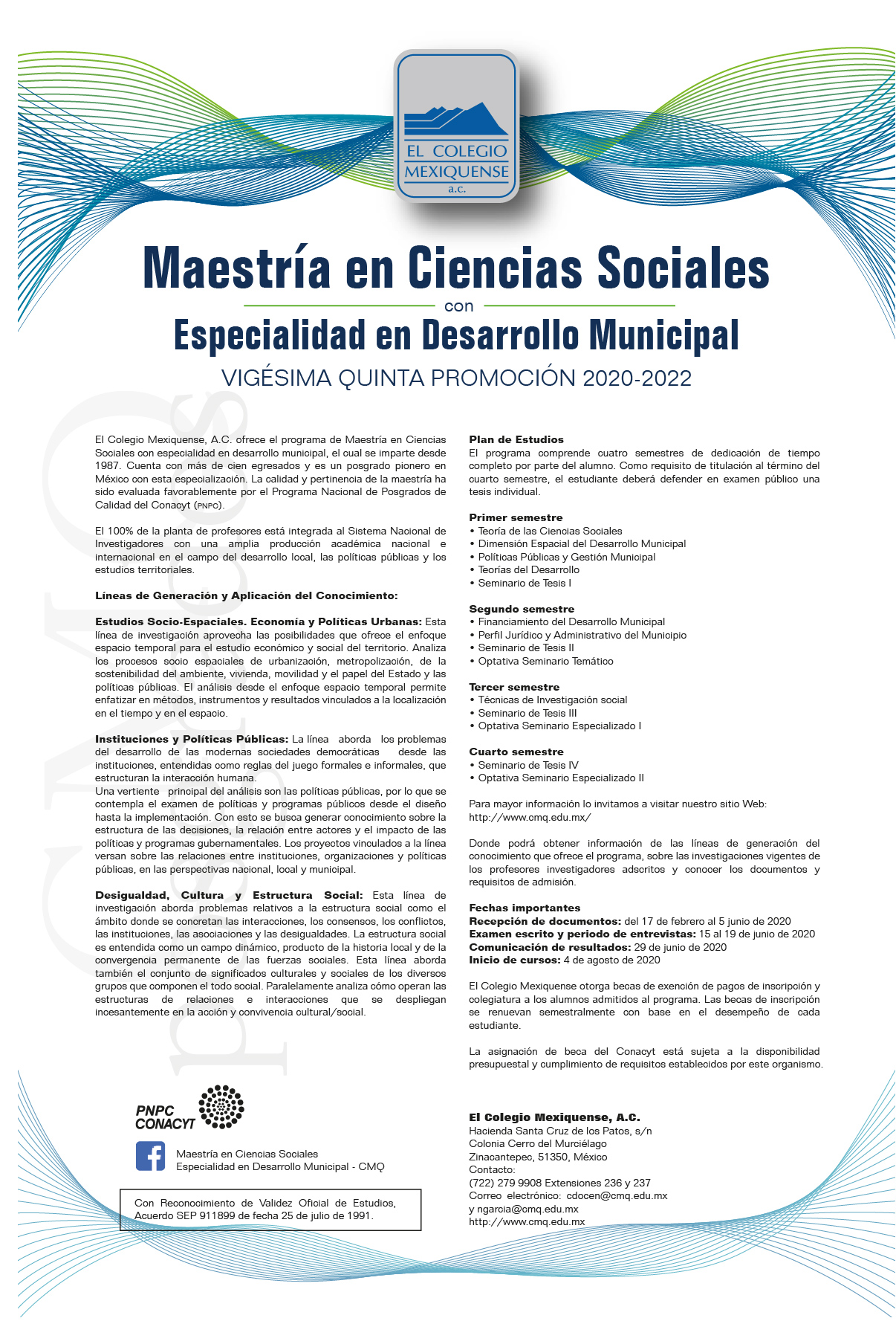 El Colegio Mexiquense inicia el proceso de selección de alumnos para la vigésima quinta promoción de la Maestría en Ciencias Sociales con Especialidad en Desarrollo Municipal, la cual está inscrita en el Padrón Nacional de Posgrados de Calidad (PNPC) del Consejo Nacional de Ciencia y Tecnología (Conacyt) y tiene una planta de 18 profesores-investigadores que forman el núcleo académico básico, todos integrantes del Sistema Nacional de Investigadores (SNI), para atender tres líneas generales de generación y aplicación de conocimiento.