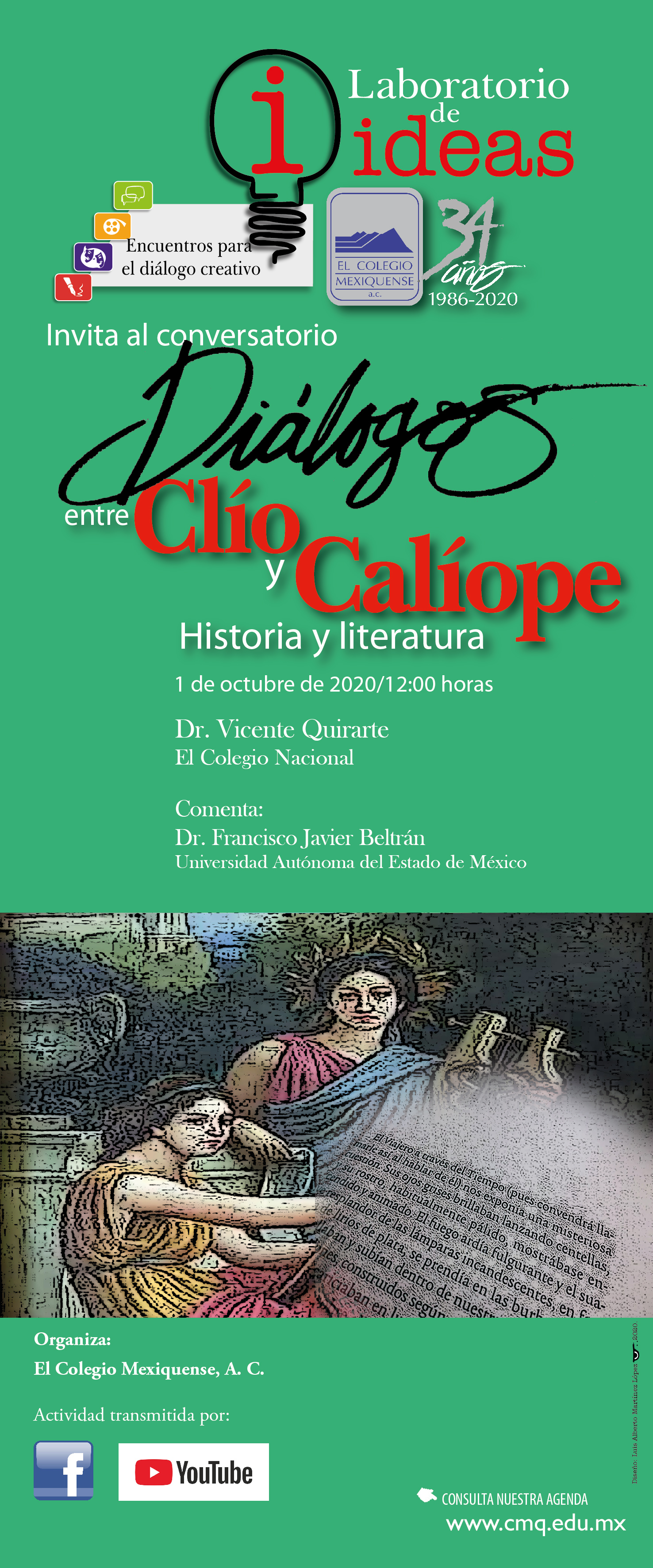 Este jueves 1 de octubre, El Colegio Mexiquense cumplirá 34 años de haber sido constituido y para el efecto, iniciará, a las 12:00, un programa de actividades realizadas por medios digitales y abiertas a toda la sociedad, con un mensaje del presidente de la institución, César Camacho, para dar paso en seguida a la conferencia «Diálogos entre Clío y Calíope. Historia y literatura», que ofrecerá el destacado poeta, investigador y ensayista Vicente Quirarte, académico de la UNAM e integrante de El Colegio Nacional, con los comentarios de Francisco Javier Beltrán, profesor-investigador de la Universidad Autónoma del Estado de México.