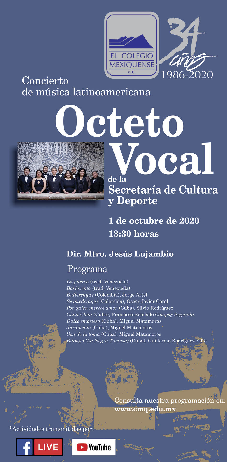 Al término de la conferencia, que forma parte del Laboratorio de Ideas «Encuentros para el diálogo creativo», el Octeto Vocal de la Secretaría de Cultura y Turismo del gobierno del Estado de México, dirigido por Jesús Lujambio, ofrecerá, al filo de las 13:30, un concierto de música latinoamericana dedicado a El Colegio Mexiquense.