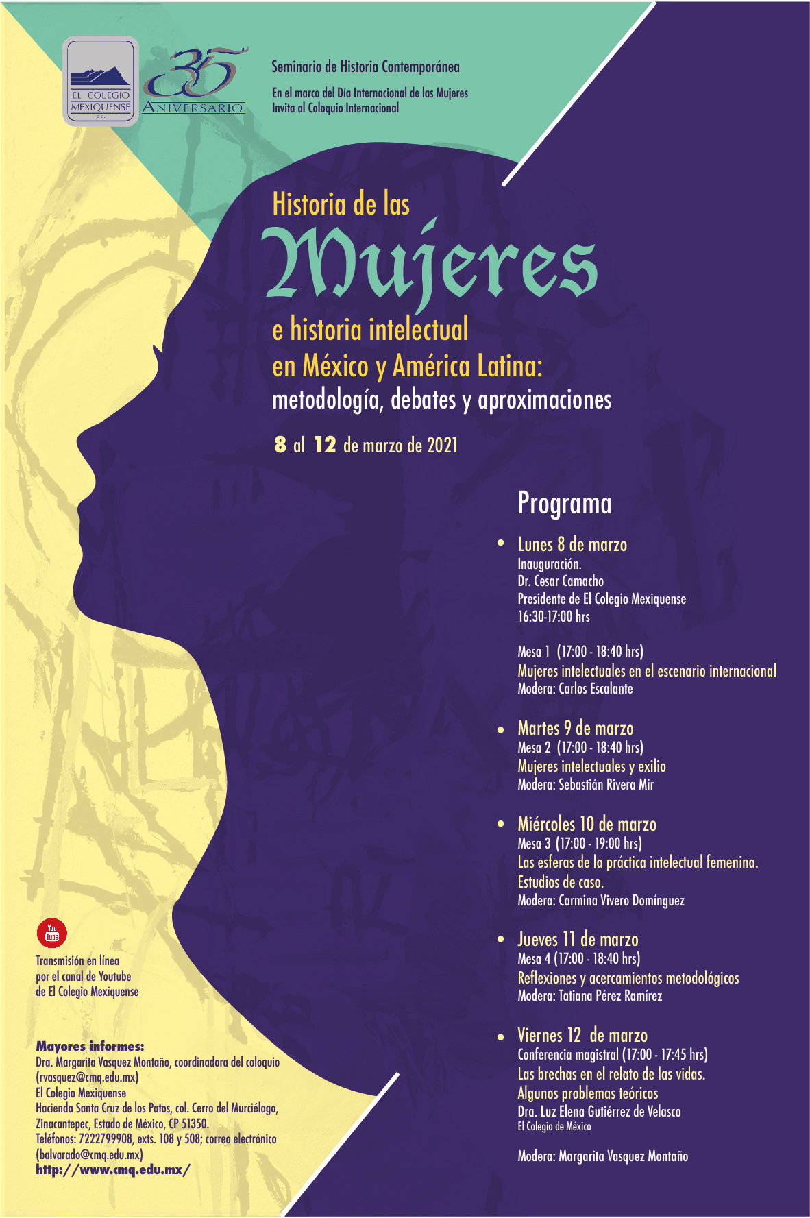 Del lunes 8 al viernes 12 de marzo se llevará a cabo el coloquio «Historia de las mujeres e historia intelectual en México y América Latina», en el cual se darán cita 15 investigadoras y tres investigadores de 13 instituciones y siete países, en sesiones que iniciarán a las cinco de la tarde y serán transmitidas por redes sociales para asegurar la más amplia difusión y participación.