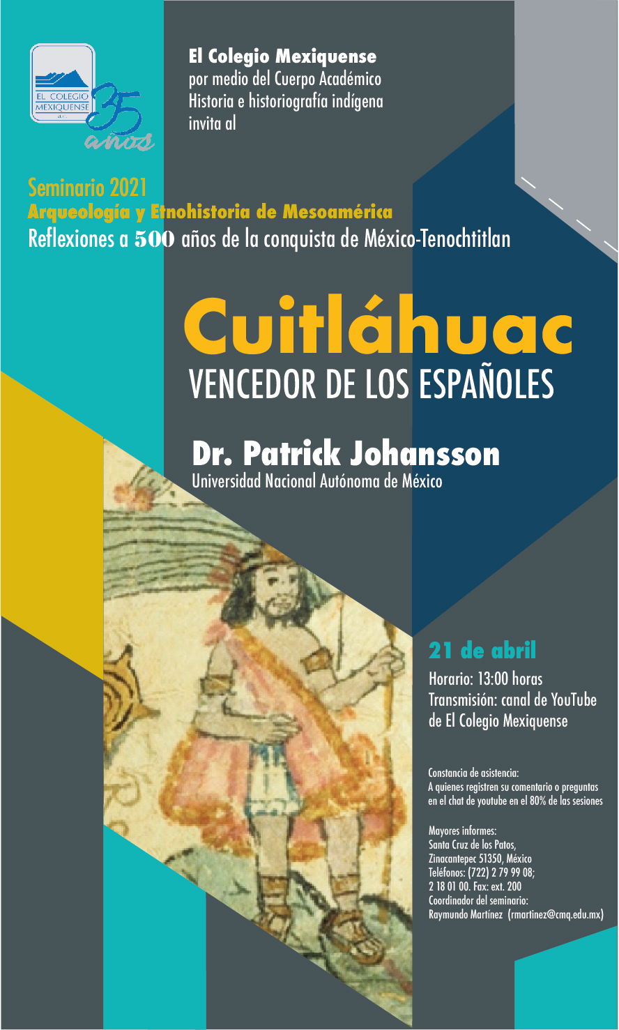 La conferencia organizada para este miércoles 21 de abril a la una de la tarde es «Cuitláhuac: vencedor de los españoles», que será ofrecida por Patrick Johansson, otro reconocido historiador..