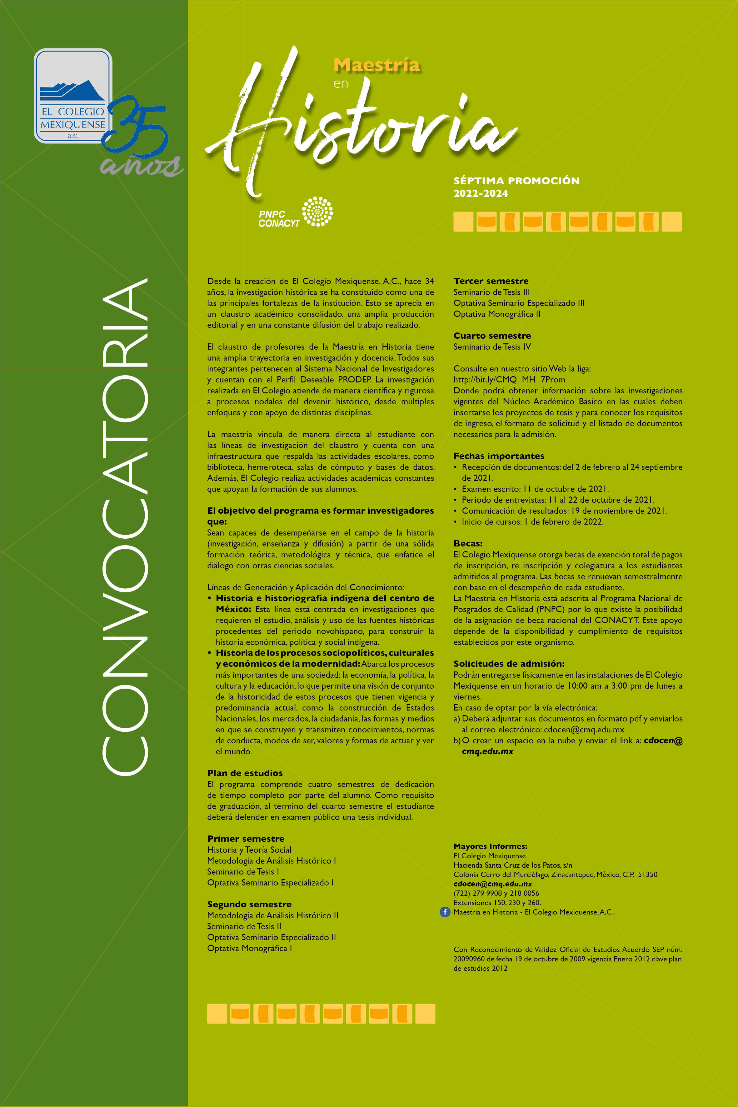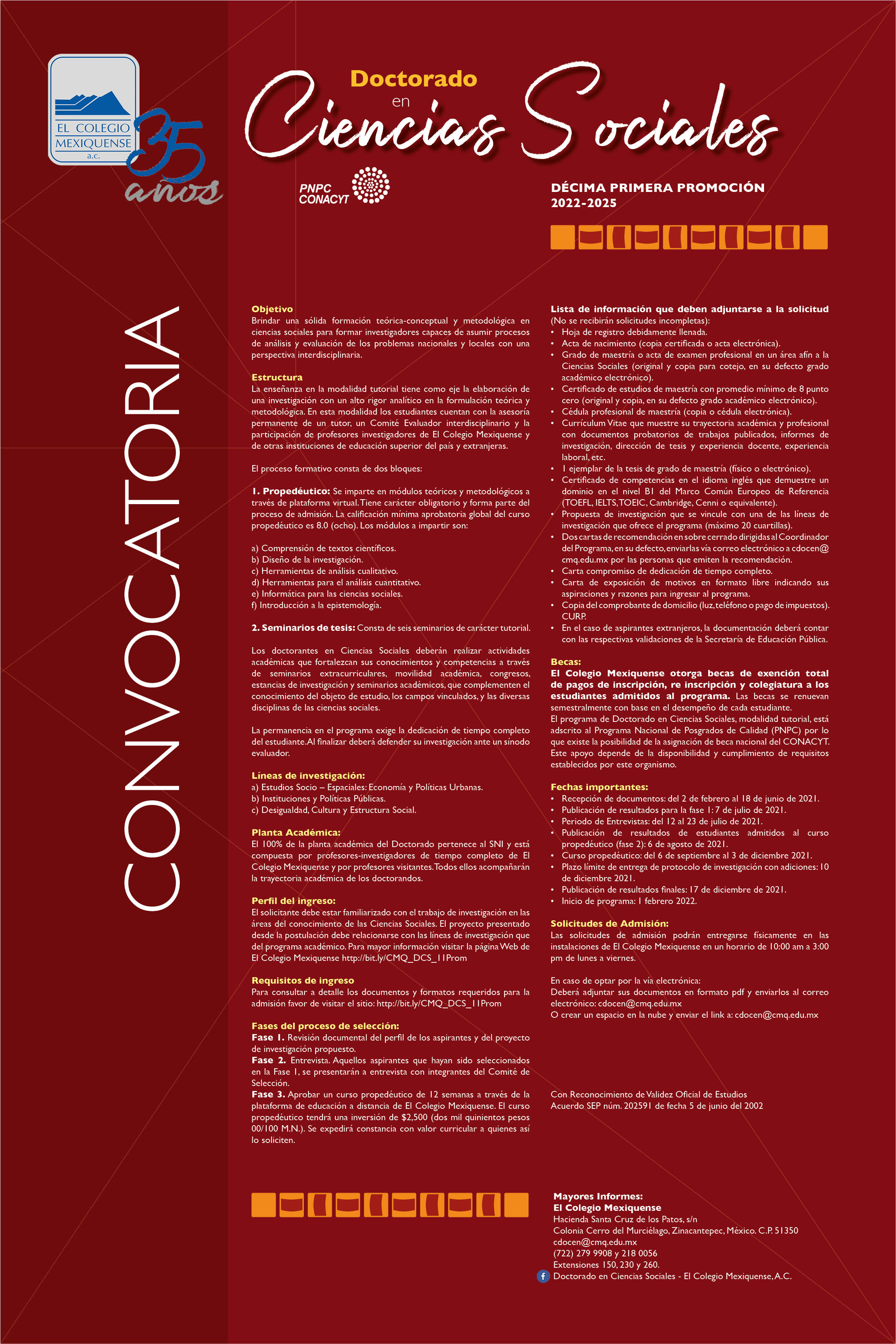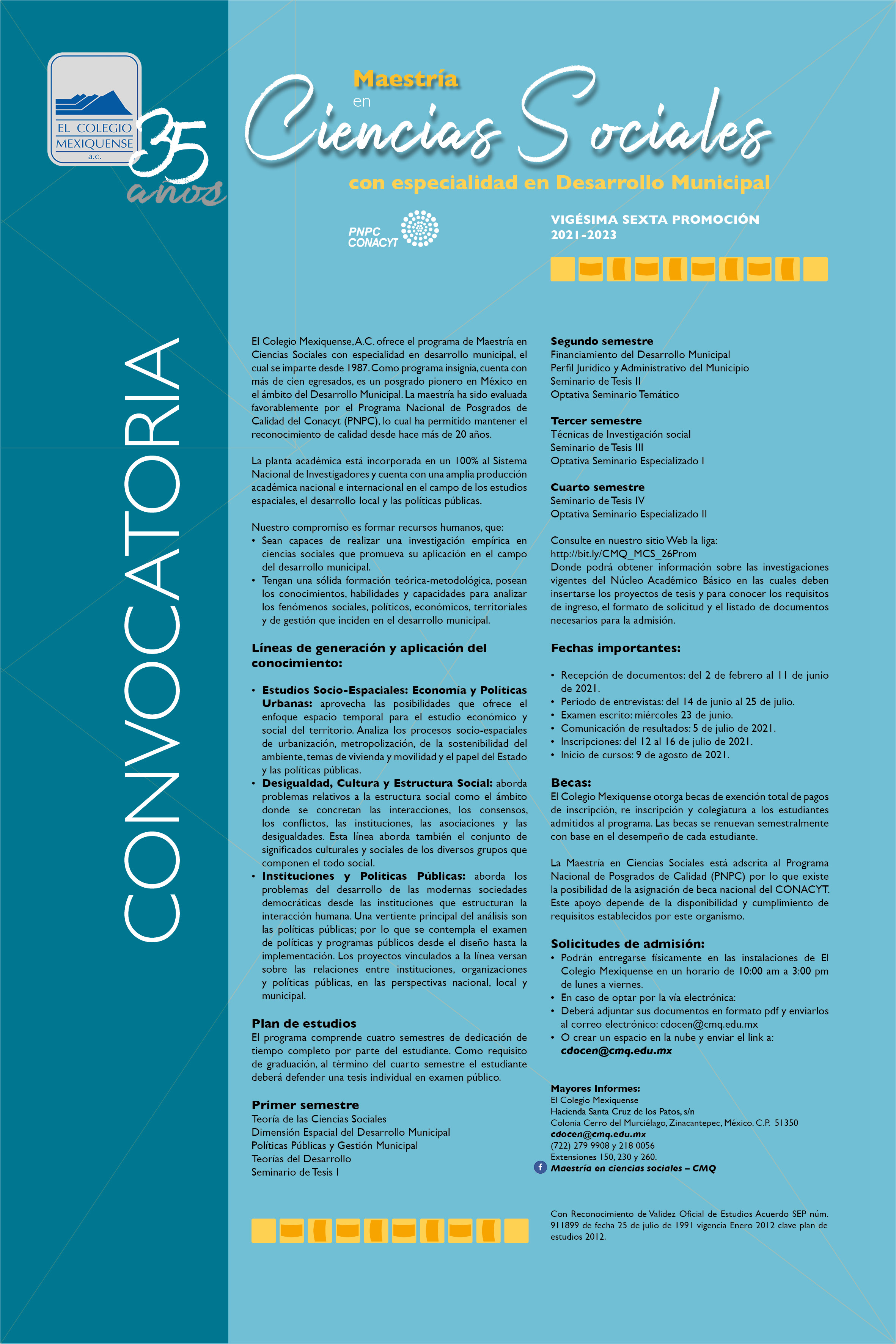 Las convocatorias pueden consultarse en la página electrónica de El Colegio Mexiquense: www.cmq.edu.mx, y las fechas a tomar en consideración para la entrega de documentos son las ya mencionadas: 11 de junio para la Maestría en Ciencias Sociales con Especialidad en Desarrollo Municipal, 18 de junio para el Doctorado en Ciencias Sociales y 24 de septiembre para la Maestría en Historia.