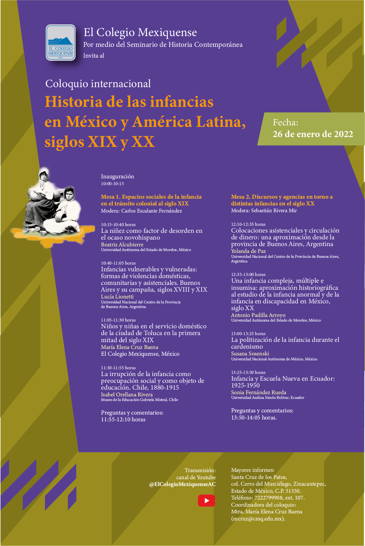 Invitó a participar en el encuentro que será transmitido por Facebook Live y YouTube a vez de explicar que la idea del encuentro surgió del tema de investigación que trabaja en El Colegio Mexiquense, de cuya maestría en Historia es egresada, y que es del trabajo infantil en el siglo XIX.