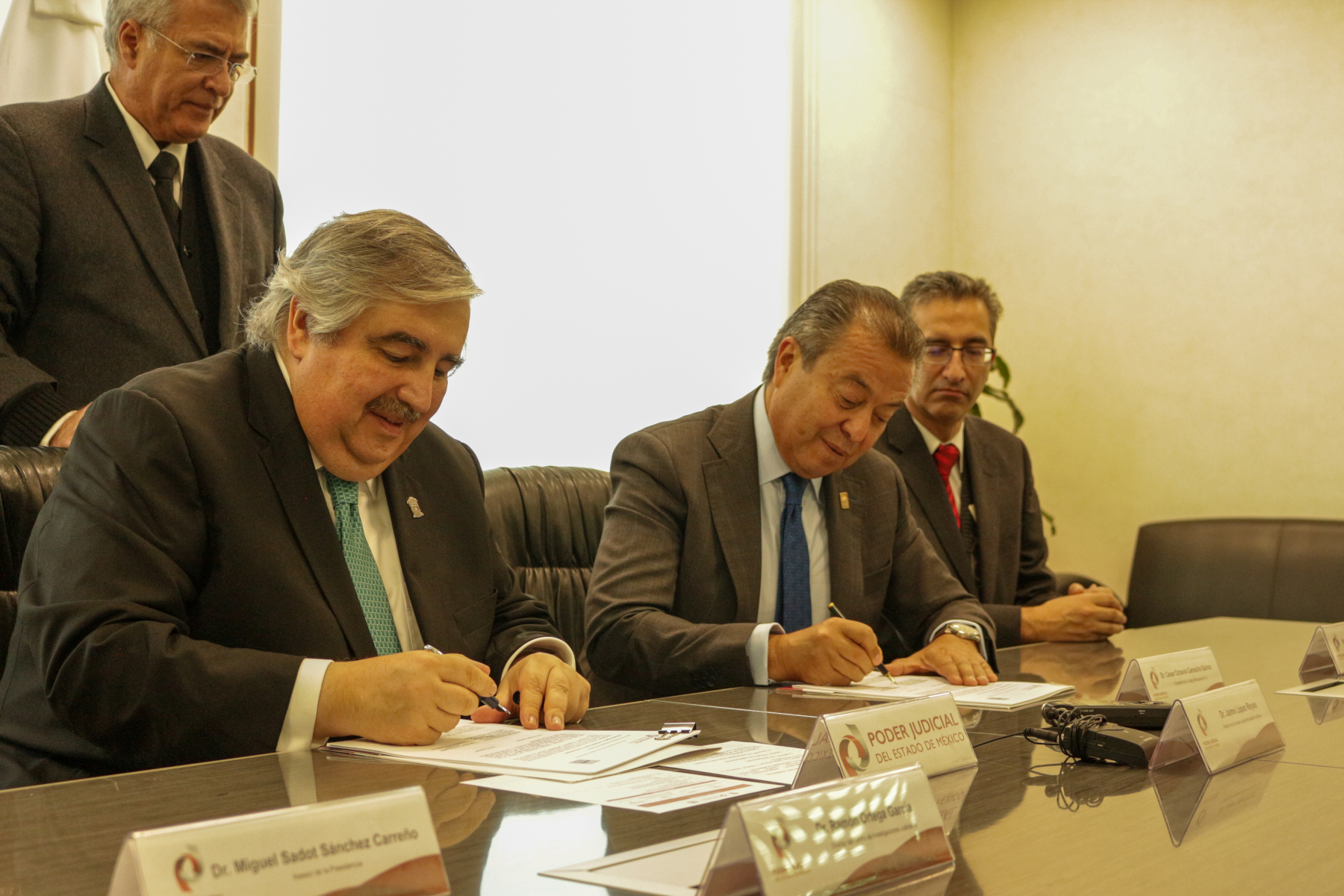 El Colegio Mexiquense fortalece cada día su compromiso de servicio a la sociedad, el cual incluye la suma de esfuerzos con otras instituciones y la multiplicación de las tareas de divulgación del conocimiento, dijo el presidente de la institución César Camacho en la firma de un convenio amplio de colaboración con el Poder Judicial, en un acto con el presidente de este, Ricardo Sodio Cuellar.