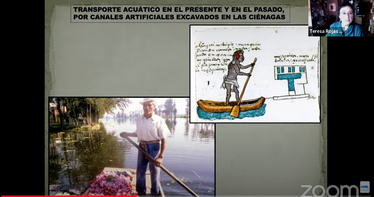 Rojas Rabiela explicó de entrada su propuesta de enfoque etnohistórico para abordar el tema y dijo que los humedales son ecosistemas terrestres en los que se da la saturación por agua como factor dominante que determina la naturaleza del suelo y de la vida, y se refirió asimismo a los campos drenados y las chinampas propiamente dichas, detallando las características de unos y otras.