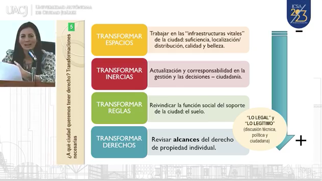 El derecho a la ciudad tiene como punto central transformar la manera en que se produce y se gestiona la ciudad, atender inercias e impulsar la participación, así como cambiar las reglas, que es el propósito más difícil, por la tensión que se da entre la propiedad individual y el espacio público, dijo Carolina Inés Pedrotti.