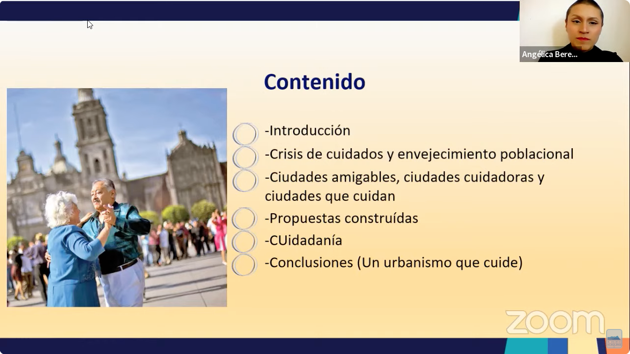 Mientras Nancy Aidée Arzate Salgado, de la UAEMéx, expuso «La importancia del espacio construido para el bienestar en la vejez», con énfasis en la importancia de la aceptación del proceso de envejecimiento, Angélica Berenice Ledesma García, del IPN, presentó «Formación de la ciudadanía desde la academia para el logro de ciudades amigables. Ciudad y Adultos Mayores».