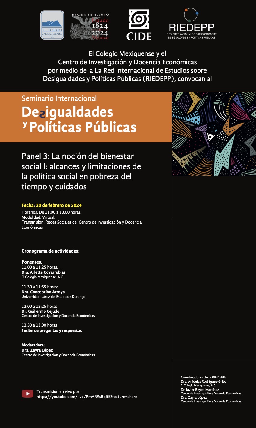 Las actividades de la semana incluyen la participación de la investigadora Arlette Covarrubias Feregrino en el tercer panel del seminario internacional Desigualdades y políticas públicas, dedicado a «La noción del bienestar social: alcances y limitaciones de la política social en pobreza del tiempo y cuidados», tema en el que la académica de El Colegio Mexiquense es especialista. La transmisión se podrá seguir por el canal de YouTube del Centro de Investigación y Docencia Académicas (CIDE), el martes 20 de febrero, a partir de las 11 de la mañana.