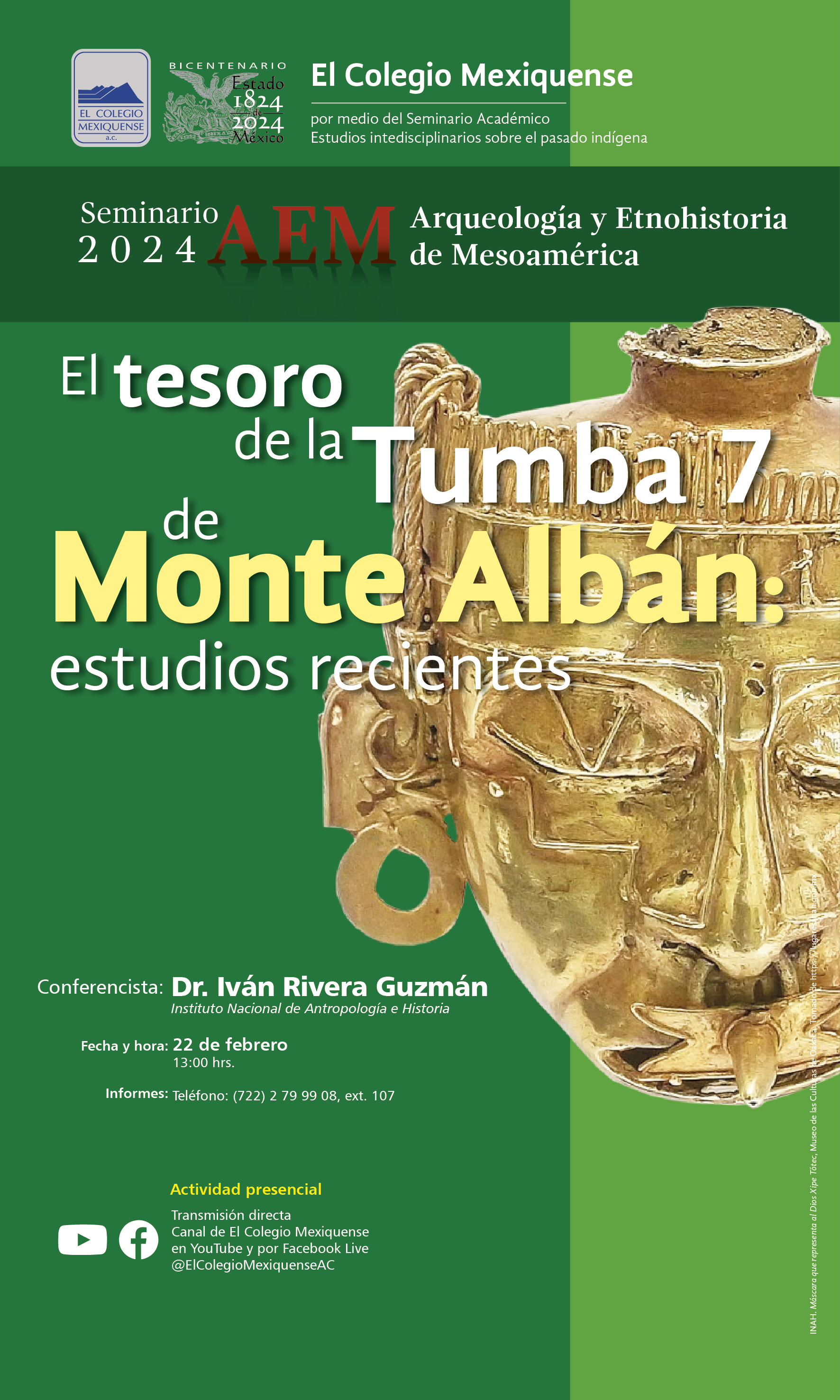 En tanto, el jueves 22, a la una de la tarde, tendrá lugar la primera conferencia del ciclo 2024 del seminario Arqueología y Etnohistoria de Mesoamérica, la cual se titula «El tesoro de la Tumba 7 de Monte Albán: estudios recientes», por parte de Iván Rivera Guzmán, investigador del INAH.