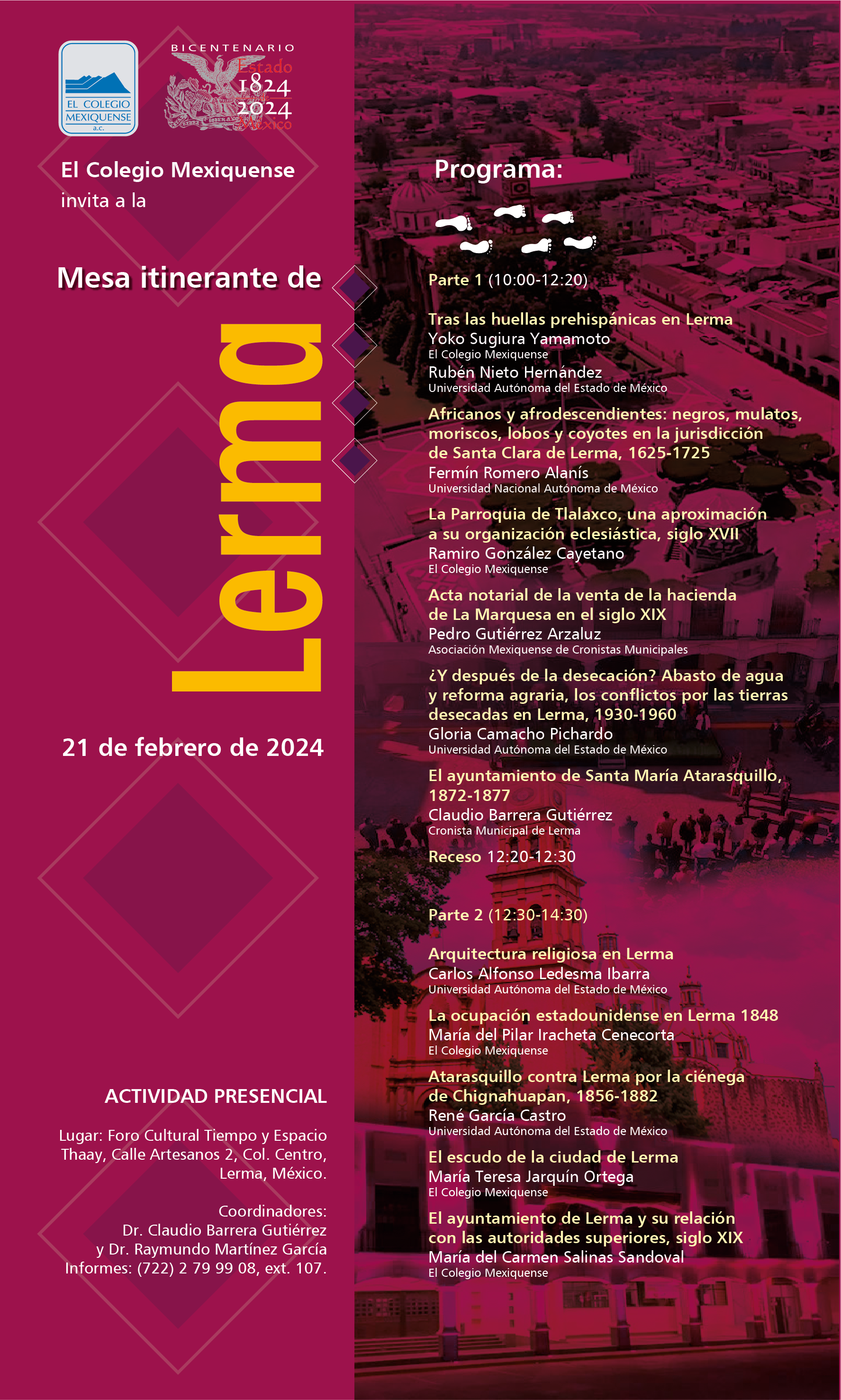 En este caso, la mesa itinerante de Lerma iniciará con la ponencia «Tras las huellas prehispánicas en Lerma», por parte de los arqueólogos Yoko Sugiura Yamamoto (CMQ) y Rubén Nieto Hernández (UAEMéx); en seguida, Fermín Romero Alanís (UNAM) expondrá «Africanos y afrodescendientes: negros, mulatos, moriscos, lobos y coyotes en la jurisdicción de Santa Clara de Lerma, 1625-1725».